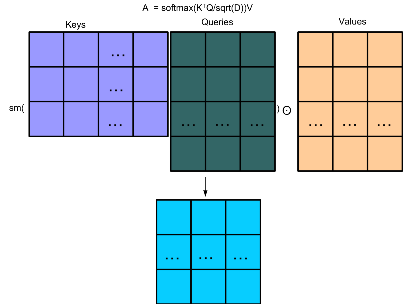 Softmax is calculated row by row. \(\odot\) is element-wise product. Dimensional scaling \(\sqrt(D)\) for stability.