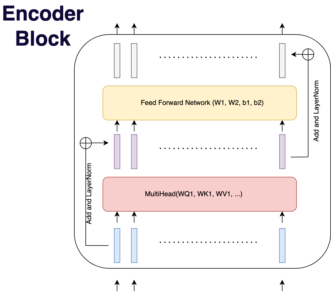 The operations of self-attention, feed forward networks, and layer-normalisation make an encoder block.