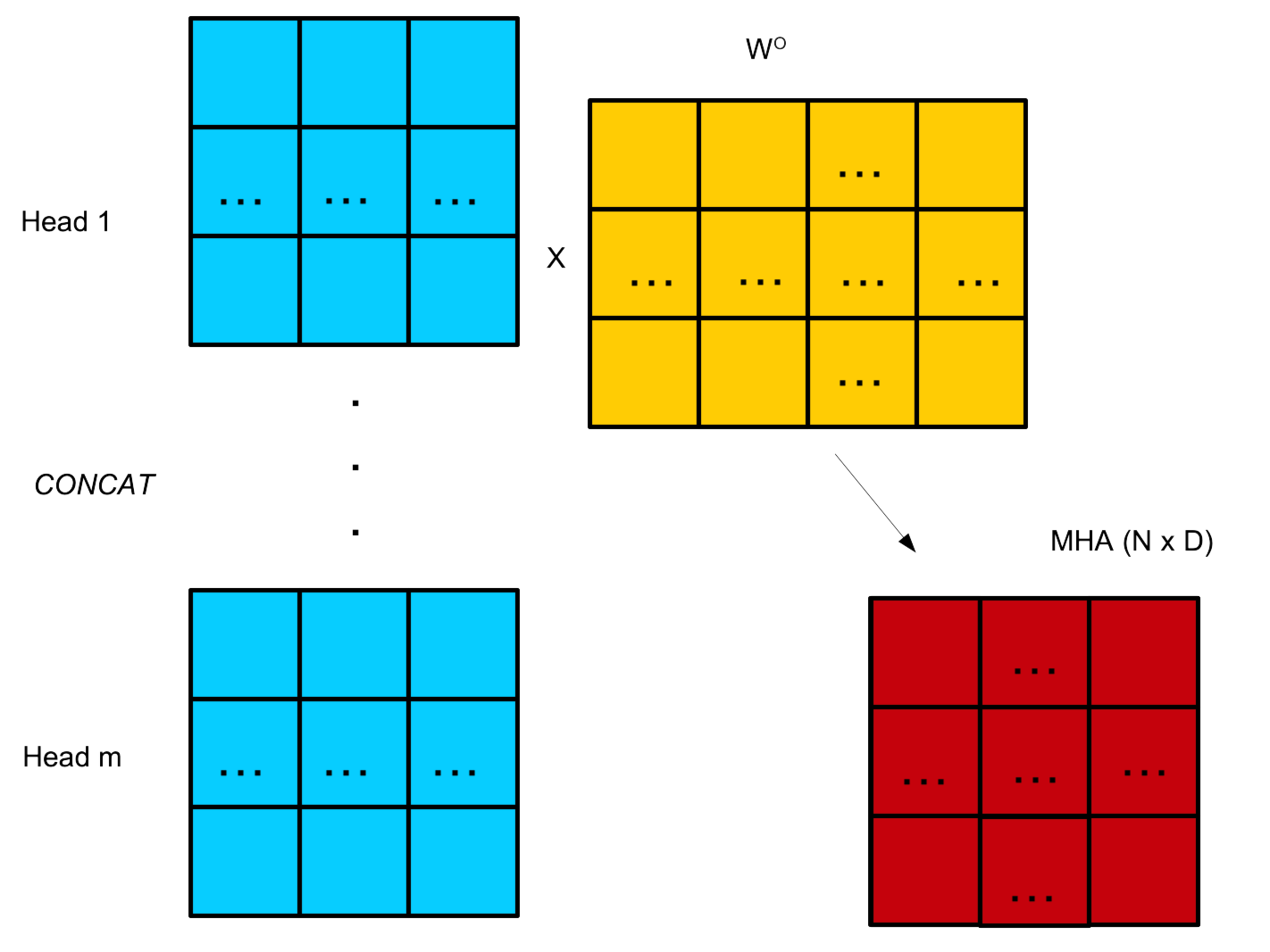 The outputs of the attention mechanism are mutliplied by matrix \(W^O\) to remebbed vectors into length D.