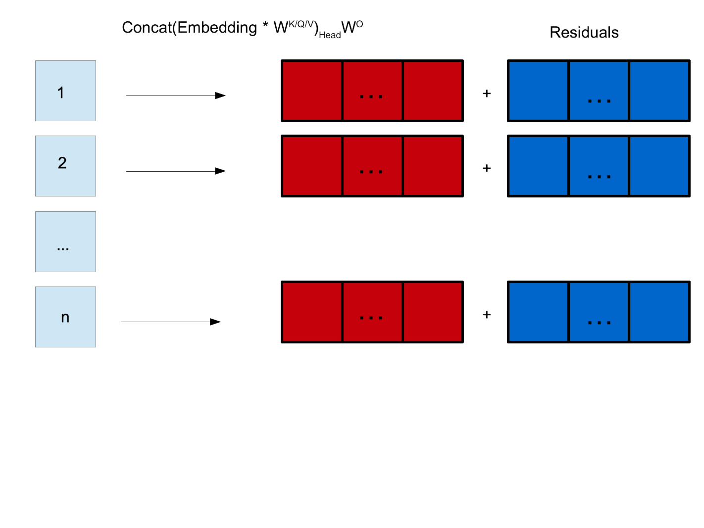 This can be efficiently encoded by simply concatenating each individual head. Usually, \(n \times h_d = D\).