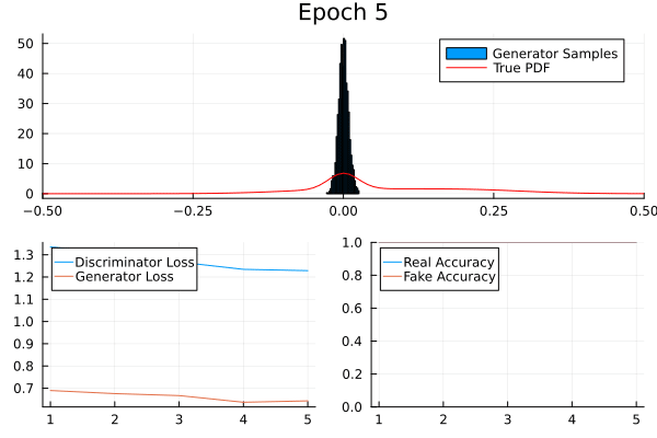 The generator \(G\) takes a latent vector \(z \sim U(0,1)^k\) and generates a fake data sample: \[G(z) = y \sim \text{Dist}_\text{Gen}(\alpha^\prime \ldots) \]